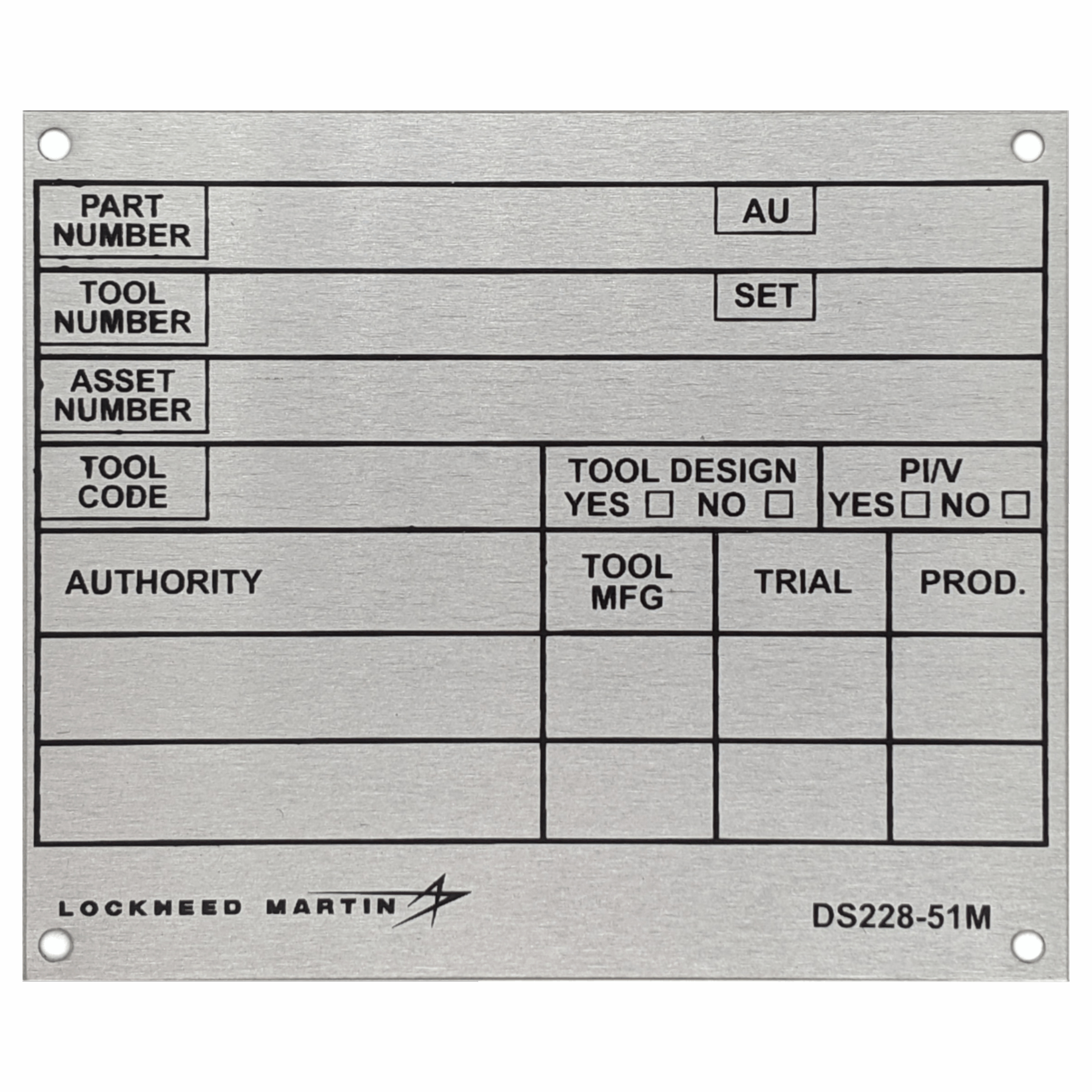 DS228-51M is a Metal Tag (.020″ x 3″ x 2.5″) made from Anodized Aluminum, 4 Holes, Adhesive Back, Square Corners. Rev LR 2017.