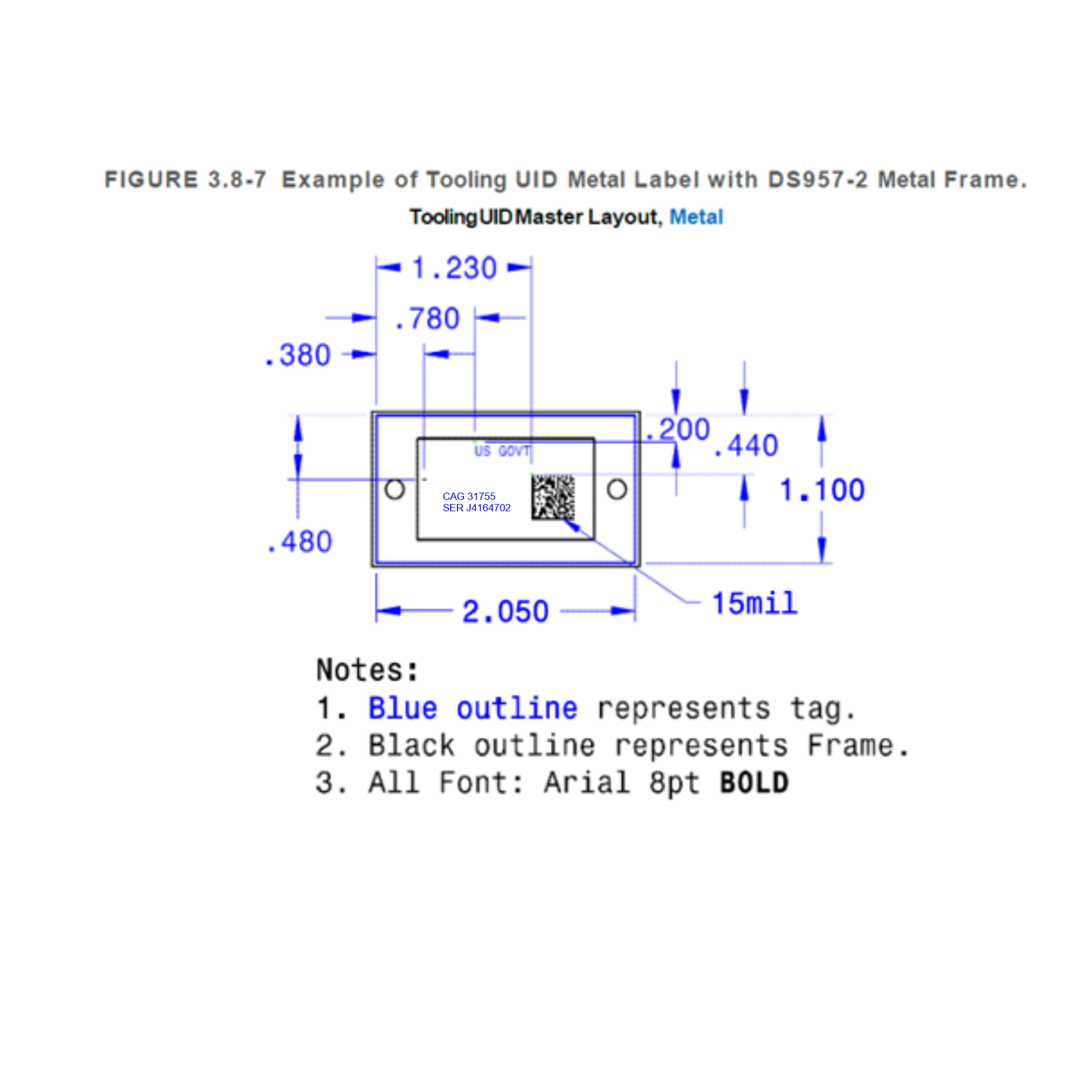 DS957-2 Tag is (.020″ x 1″ x 2.05″) aluminum with custom IUID information and 3M 467MP adhesive.
