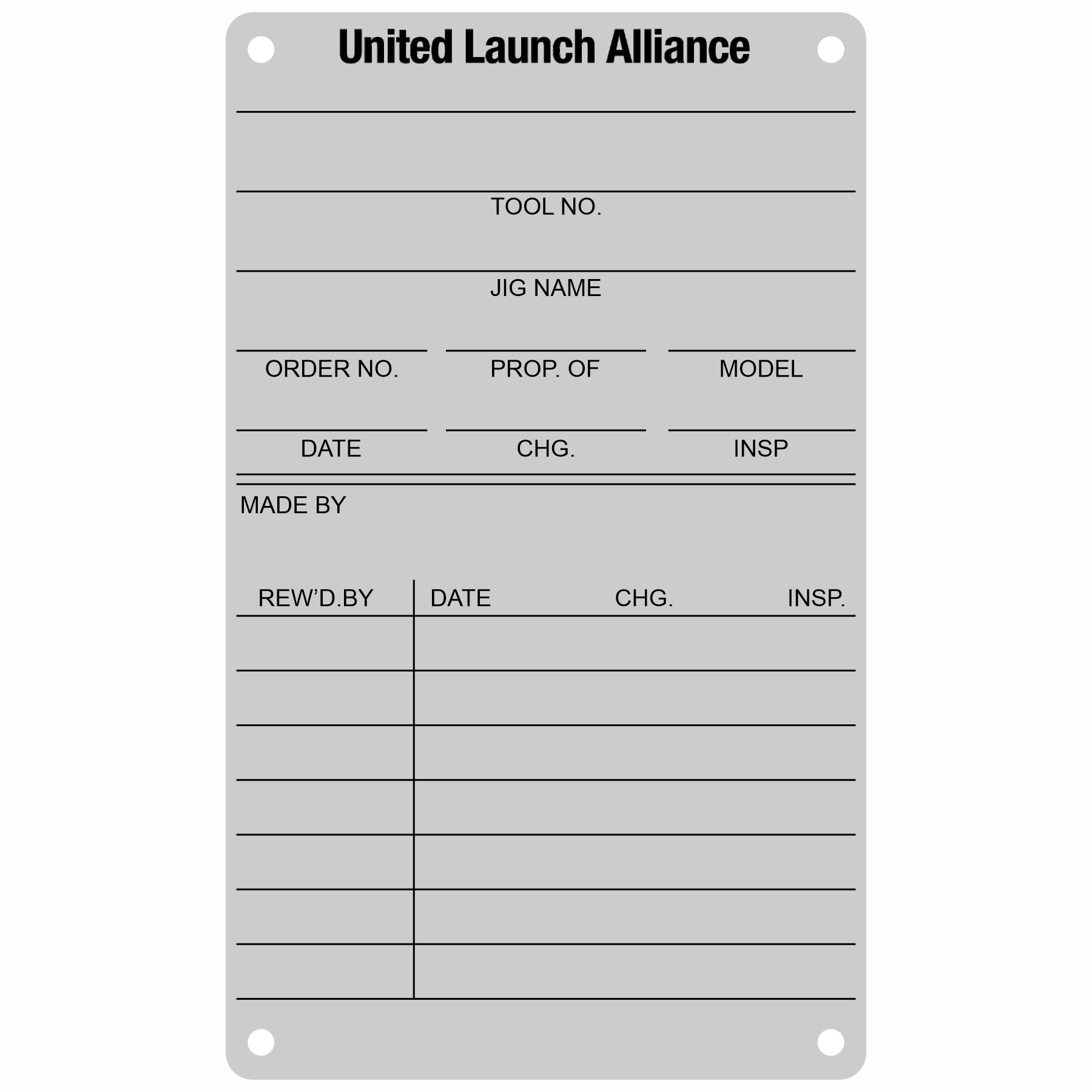 ULA-004 is a (.060″ x 3.0″ x 5.0″) aluminum tag with four holes and rounded corners.