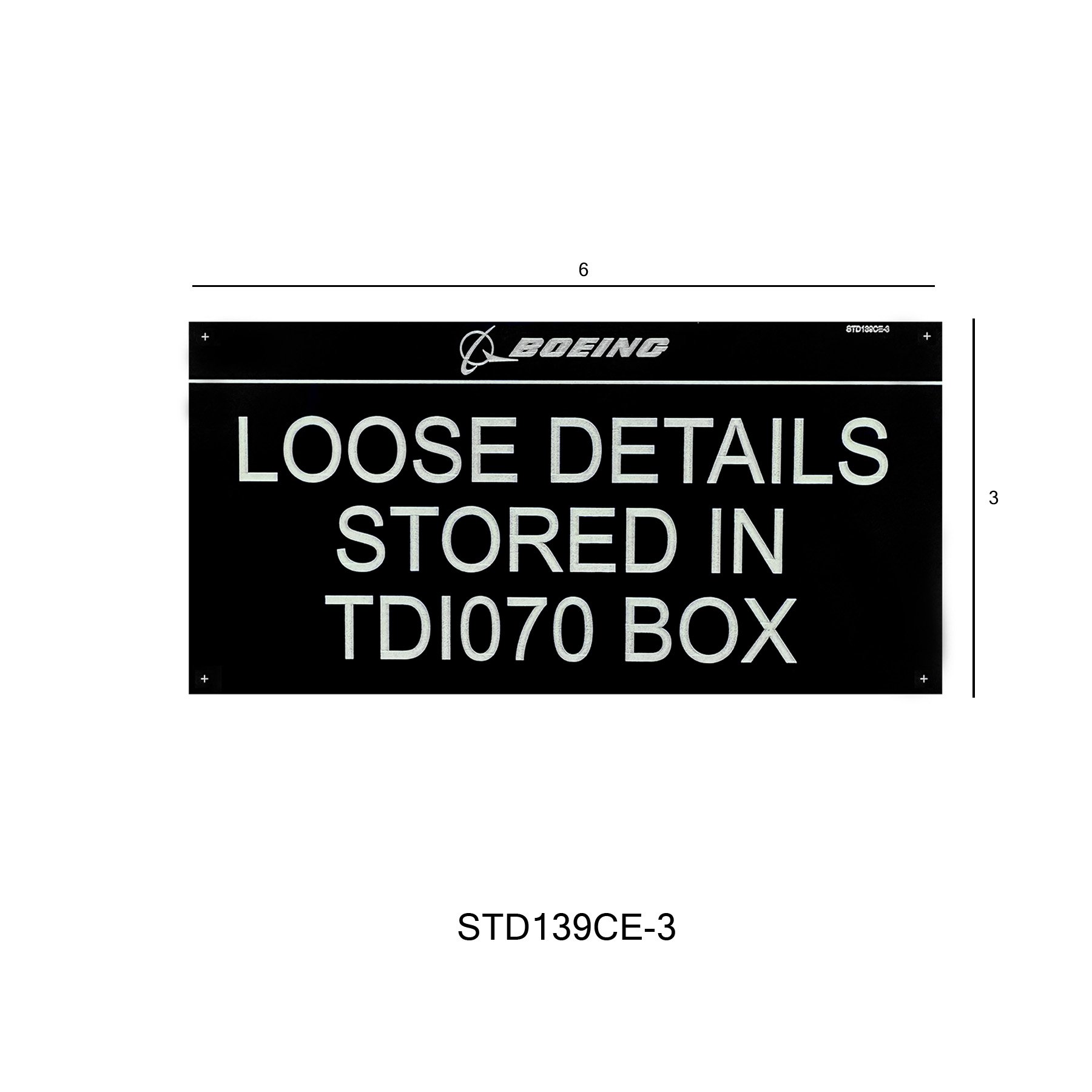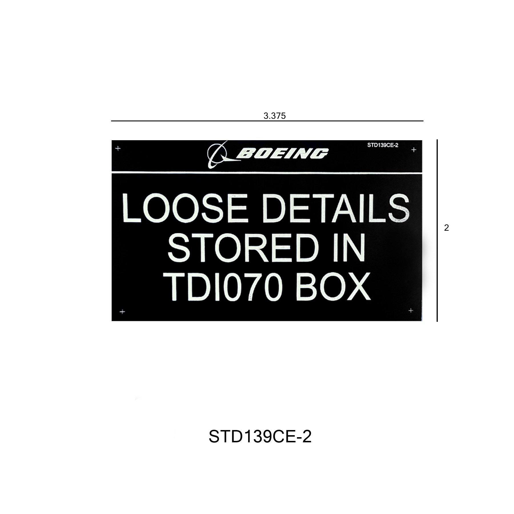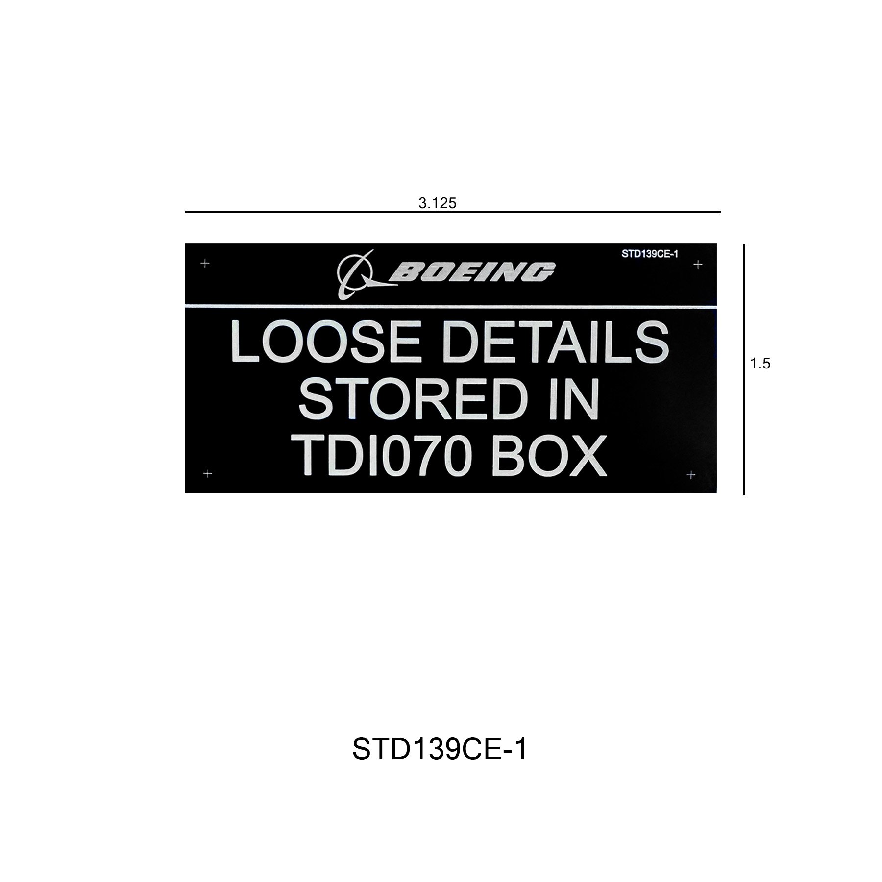 STD139CE is a 0.020″ Black Anodized Aluminum tag. Rev A 09-29-23. It comes in three different sizes: