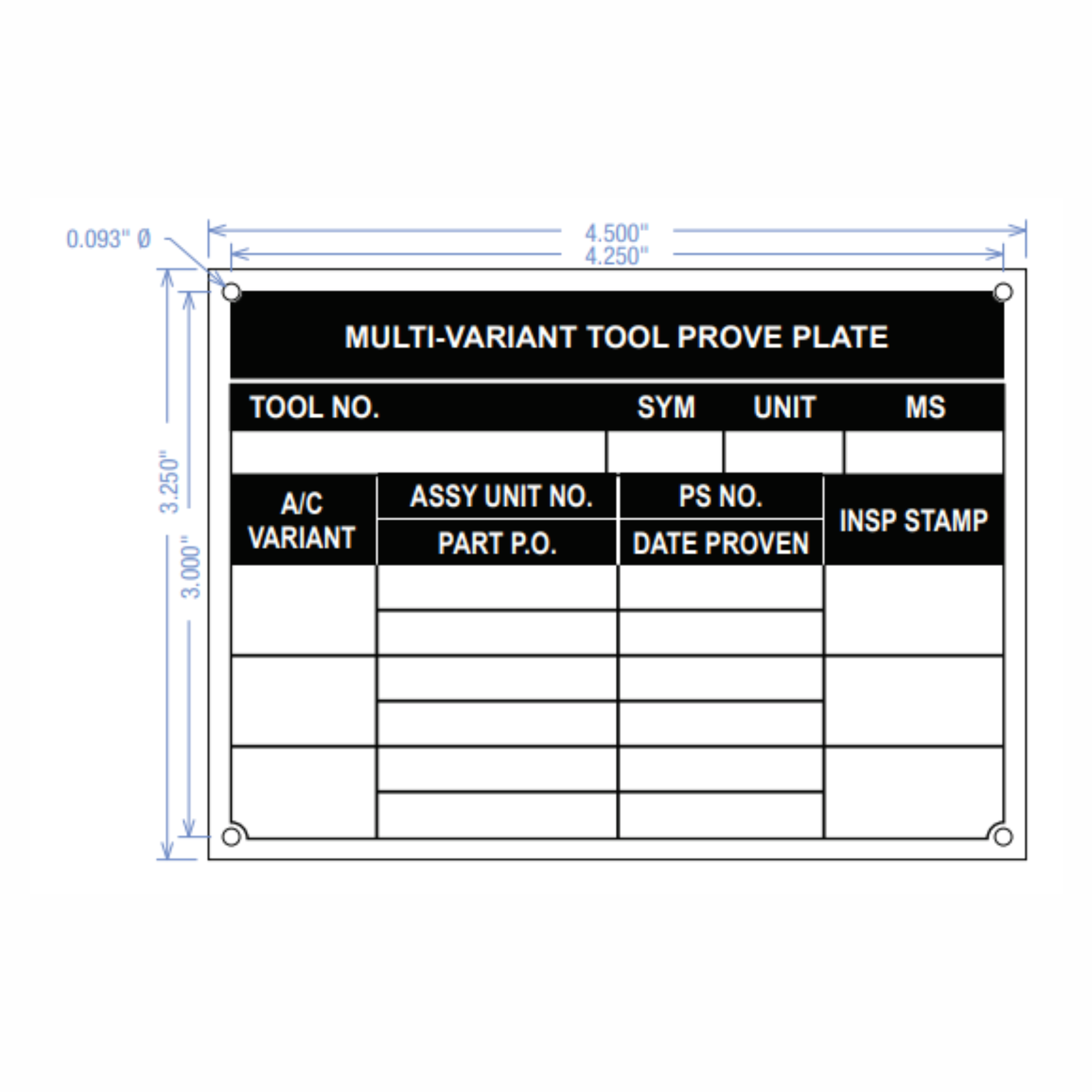 TIS-01-013 is a (.032″ x 3.25″ x 4.5″) anodized aluminum tag with four holes.