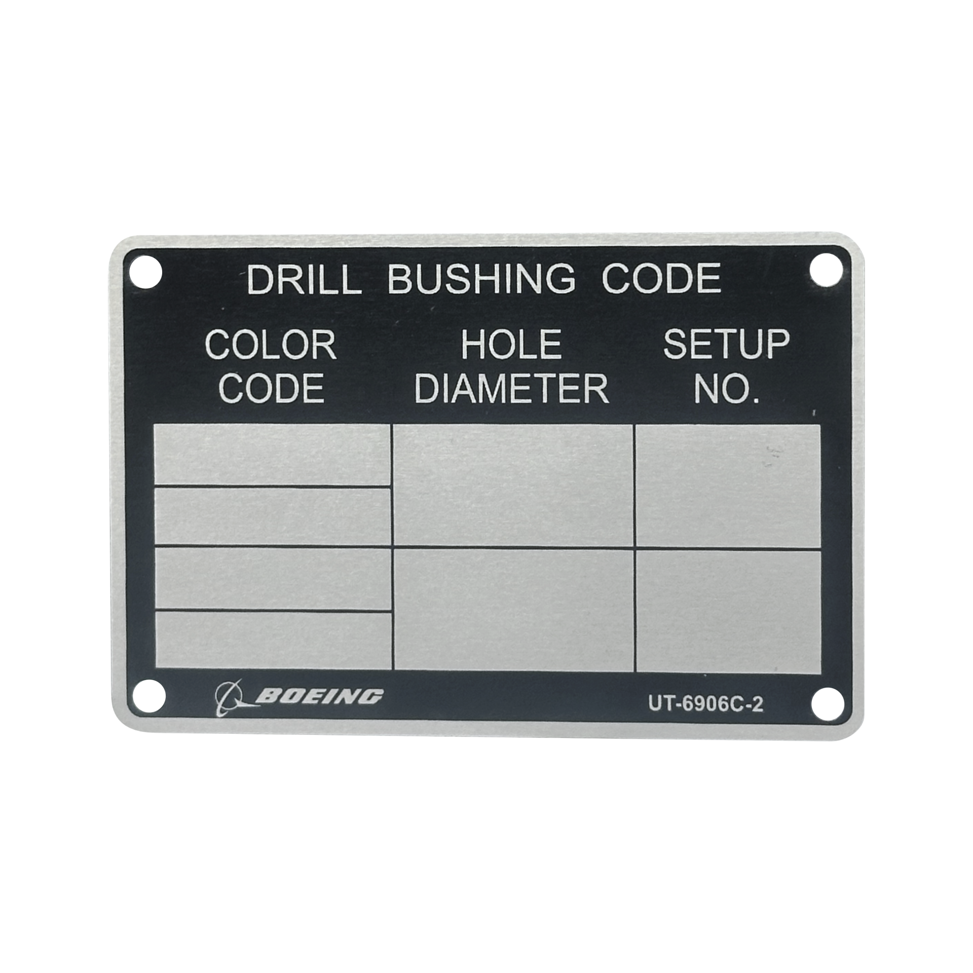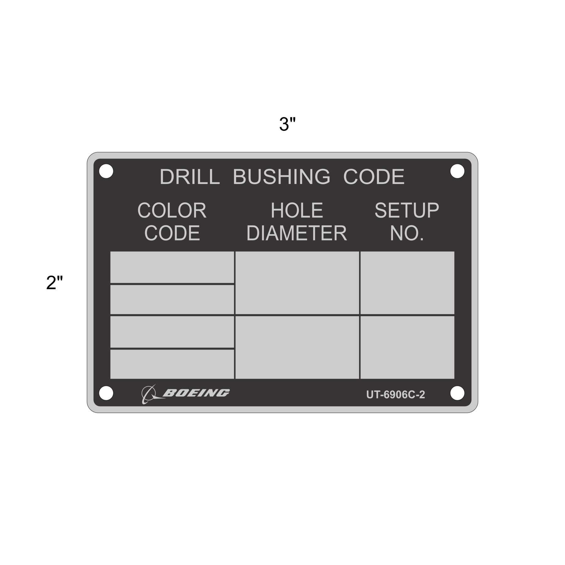 UT-6906C-2 is a (.040″ x 3″ x 2″) aluminum tag with four holes and rounded corners. Rev C 2-16-2015
