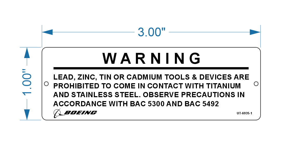 UT-6935-1 is a (.04″ x 1″ x 3″) anodized aluminum tag with red (fed standard #11105) print and two holes. Rev CC 03-Nov-2021.