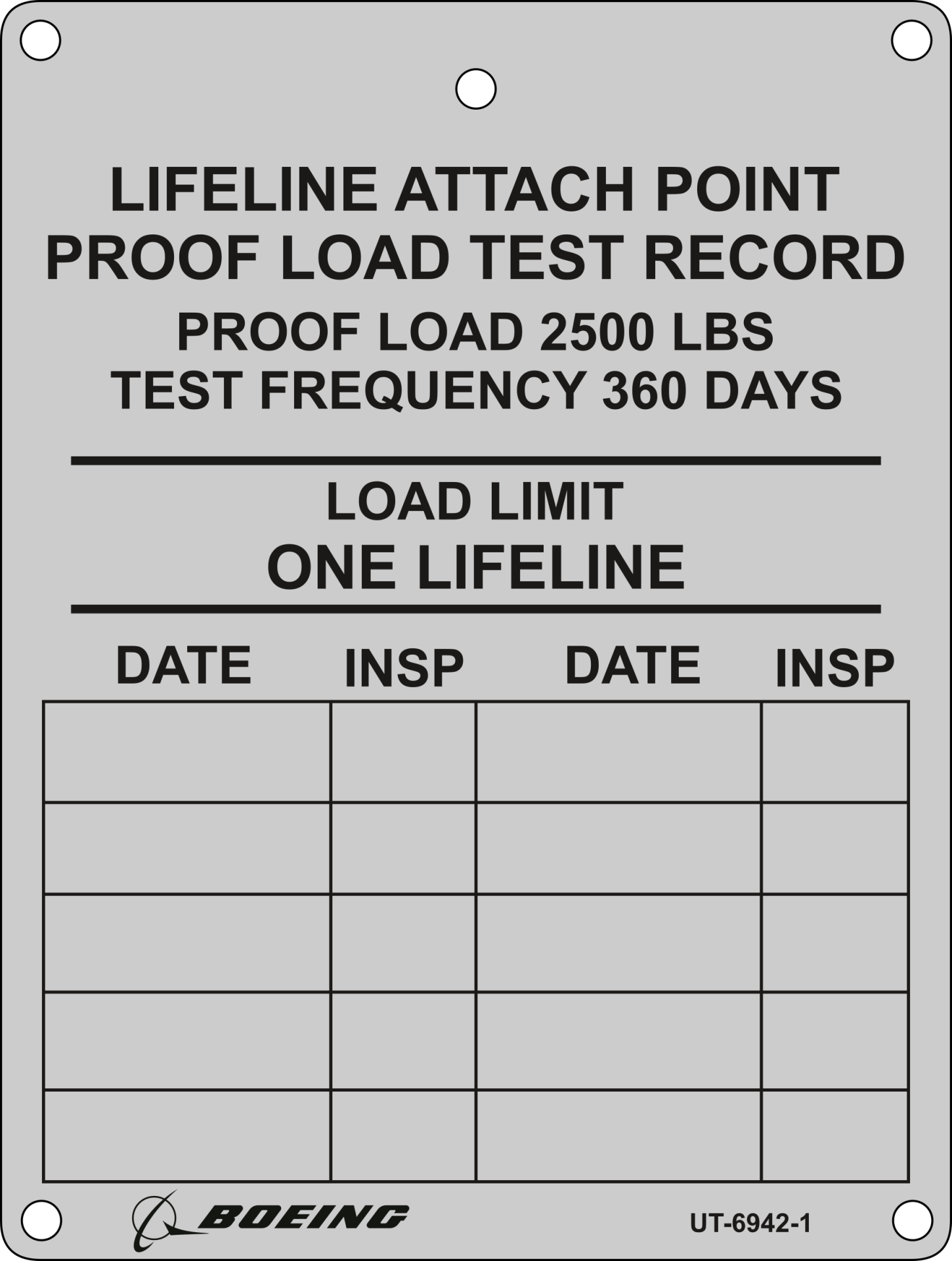 UT-6942-1 is a (.04″ X 4″ x 3″) anodized aluminum tag with five holes and rounded corners.