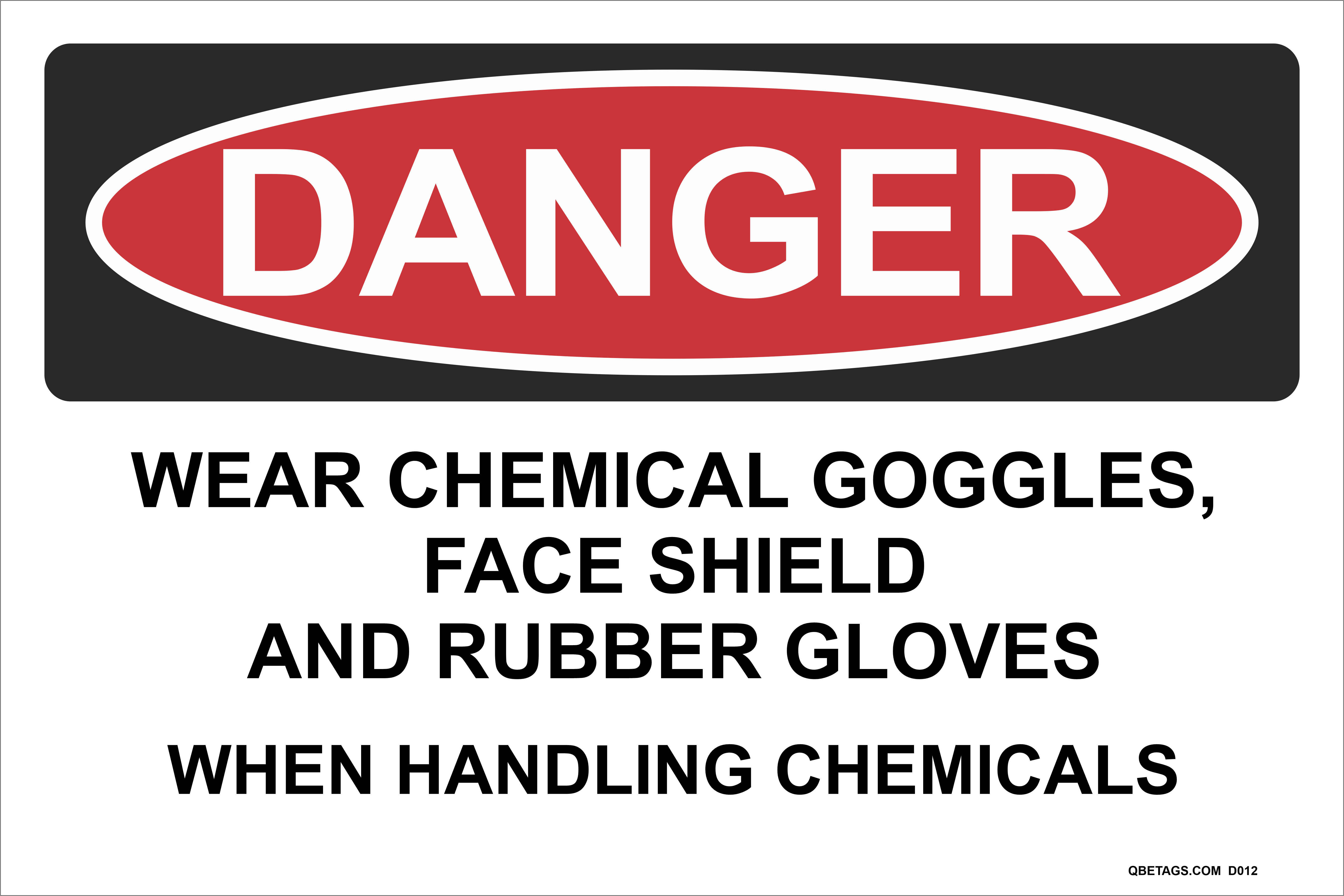 This Danger Sign helps prevent workplace accidents and protect employees and visitors, “Danger – Wear Chemical Goggles, Face Shield And Rubber Gloves When Handling Chemicals”.