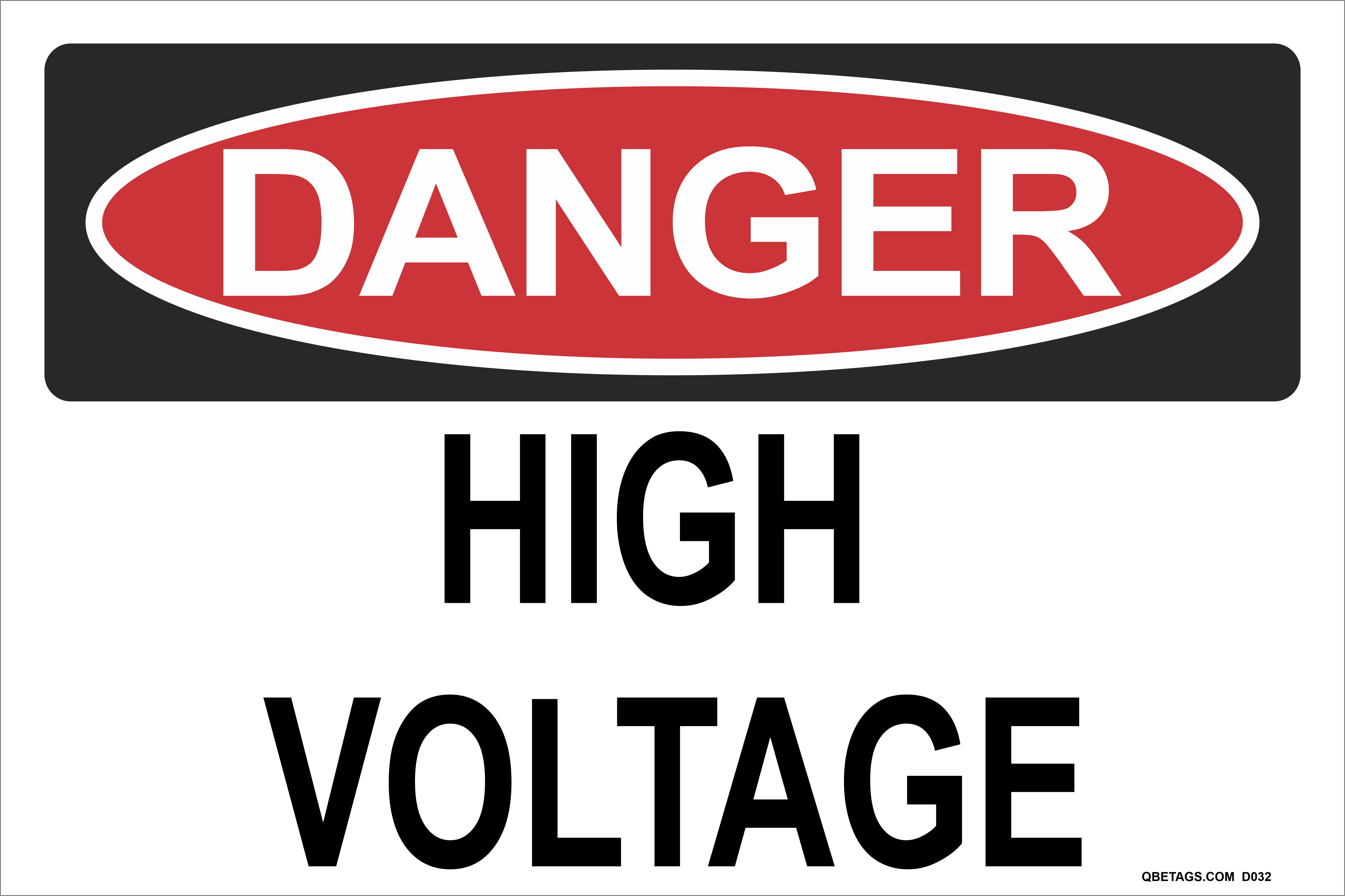 This Danger Sign helps prevent workplace accidents and protect employees and visitors, “Danger: High Voltage”.